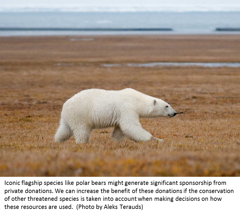 Image: Iconic flagship species like polar bears might generate signifacnt sponsorship form private donation. We can increase the benefit of these donations if the conservation of other threatened species is taken into acount when making decisions on how these resources are used. Photo: Aleks Terauds