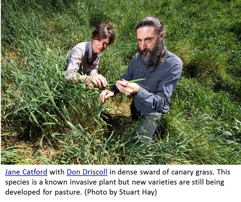 Image: Jane Catford and Don Driscoll in dense sward of canary grass.  This species is a known invasive plant but new varieties are still being developed for pasture. Phot: Stuart Hay